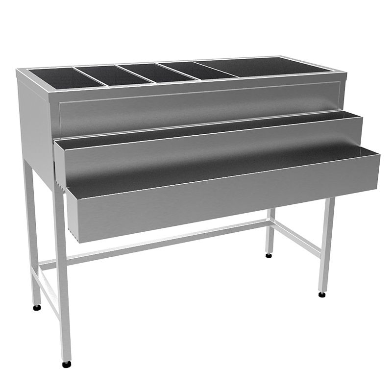 1000х600х870 Барная станция. Корпус - нерж. сталь aisi 430, мойка сварная 940х340х250мм из нерж. сталь aisi 304 теплоизолированная, раделена на 5 частей, 4 перфорированные вставки, 3 съемные перегородки, 1 несъемная, 2 съемных карманы для бутылок, каркас нерж. труба 25х25, регулируемые по высоте опоры.