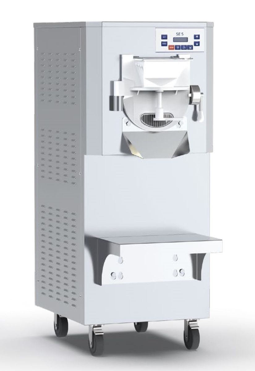 560x915x1350 мм, 220 В, 3,2 кВт, 210 кг. SE5 A Батч фризер для твердого мороженого / джелато. Загрузка за цикл 2,5-6 кг. Производительность в час до 27 кг (34 л). Объем 10 л, горизонтальный цилиндр, сталь AISI 304. Продолжительность цикла 8-15 мин. Трехлопастная мешалка с полимерными лопастями, саморегулирующиеся скребки. Электронный контроллер. Автоматические режимы приготовления: контроль температуры и времени. Полуавтоматическая выгрузка через люк. Воздушное охлаждение конденсатора