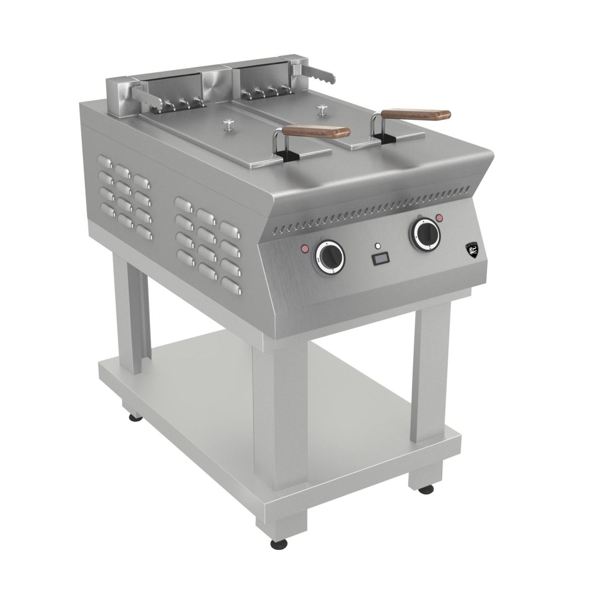 900х550х950мм,14 кВт, 400В, ТЭН-4шт., переключатели -2шт. , ток - трехфазный с нейтралью, переменный, 50Гц, 2шт. фритюрных корзины по 400*150*130мм . Макс. загрузка 2*1,0=2,0кг. Объем масла, заливаемого в ванну 2*16,3=32,6л, диапазон регулирования рабочей температуры масла в ванне 20-190С, время разогрева до рабочей температуры 20мин ,