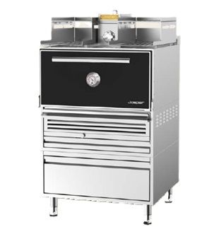 916х778х1660мм, в комплекте: искрогаситель, диффузор, щипцы, проволочная щетка, одна решетка для гриля 510*760мм и кочерга для золы, стол-подставка с ящиком, сверху подставка для подогрева, производительность - до 90 кг/час, рекомендуется для заведений с количеством посадочных мест до 120, цвет двери черный