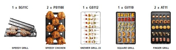 в комплекте: решетки speedy grill, speedy chicken, skewer grill 23, square grill, лоток finger grill