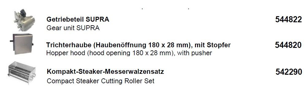 450x350x200, нерж, до 1200 стейков/час, для SUPRA, загрузочное отверстие 180x28мм (толщина мяса = 25мм) состав: 544822 шестерня (редуктор)+542290 мясорыхлитель/стейкер +544820 кожух (бункер). Мощное устройство для размягчения мяса, стейков, эскалопов и быстрого жаркого