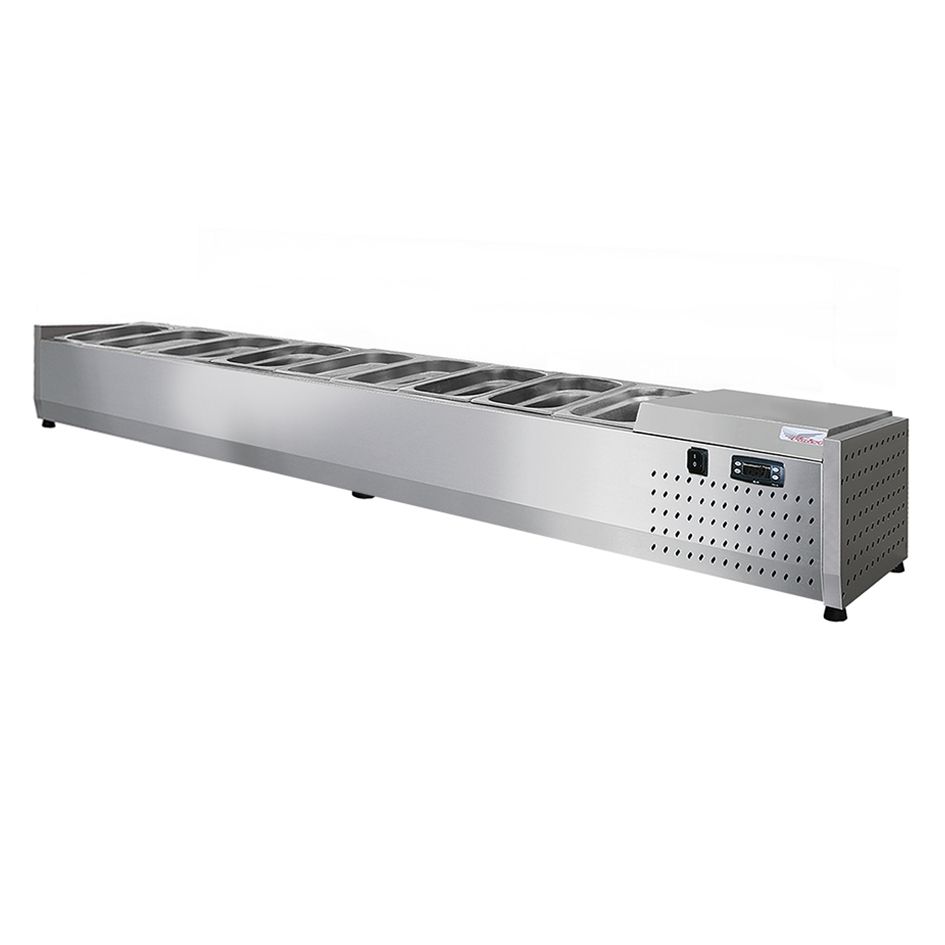 Холодильная настольная витрина ToppingBox открытая предназначена для демонстрации и кратковременного хранения подготовленных начинок/топпингов (для пиццы, блинов, лапши WOK), а также мясных изделий и полуфабрикатов на предприятиях быстрого питания и торговли. Пониженная температура позволяет в течение длительного времени сохранять вкусовые качества, внешний вид иструктуру продуктов. Прибор оснащен статическим охлаждением. Холодильная витрина - хорошее дополнение к холодильному столу или блинной станции. Технические характеристики: Температурный режим: +2...+7°С Микропроцессорный блок управления Компрессор: Aspera, ACC, Electrolux, l'unite, hermetique Мощность: 0,13кВт Потребление электроэнергии за сутки: до 1,04кВт/сут(зависит от условий эксплуатации) Статическое охлаждение Напряжение питания: 220В/50Гц Автоматическая оттайка испарителя Цельнозаливной корпус