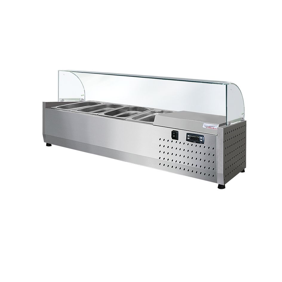 Холодильная настольная витрина ToppingBox с моллированным стеклом предназначена для демонстрации и кратковременного хранения подготовленных начинок/топпингов (для пиццы, блинов, лапши WOK), а также мясных изделий и полуфабрикатов на предприятиях быстрого питания и торговли. Пониженная температура позволяет в течение длительного времени сохранять вкусовые качества, внешний вид иструктуру продуктов. Молированное стекло предотвращает попадание в гастроемкости посторонних предметов. Холодильная витрина - хорошее дополнение к холодильному столу или блинной станции. Технические характеристики: Температурный режим: +2...+7°С Микропроцессорный блок управления Компрессор: Aspera, ACC, Electrolux, l'unite, hermetique Мощность: 0,13кВт Потребление электроэнергии за сутки: до 1,04кВт/сут(зависит от условий эксплуатации) Статическое охлаждение Напряжение питания: 220В/50Гц Автоматическая оттайка испарителя Цельнозаливной корпус