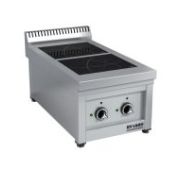 400х700х325мм, Индукционная настольная плита из нержавеющей стали имеет 2 мощные конфорки по 5кВт, выполненные из прочного стекла SCHOTT CERAN или EURO KERA. Мощность регулируется чувствительным 16-позиционным переключателем. 2х5кВт, конфорка: 310х270см, толщина-6мм, питание: 380В
