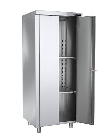 700х600х1730мм, кол-во полок 2шт., нагрузка на полку 30кг. Материал шкафа нержавеющая сталь AISI430 0,8мм. Материал дна и задней стенки шкафа оцинкованная сталь 1,2мм, распашные двери с замком. Регулировка опорных ножек 20мм. Вес 68кг. Сборная бескаркасная конструкция. Дно и задняя стенка изготовлены из оцинкованной стали. Внутри шкафа расположены две полки. Конструкция шкафа позволяет изменять высоту полок с шагом 100 мм. Предназначен для использования в различных цехах предприятий общественного питания: - моечные отделения: для кратковременного и длительного хранения посуды, баков, котлов; - кладовые: для хранения сухих видов продуктов; - специализированные цеха (горячие, салатные, мясные и т. д.), где требуется размещение посуды или продуктов в непосредственной близости от рабочего места повара. Шкаф поставляется в сборе..