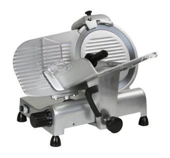 Габариты 570 x 480 x H 420 мм. Диаметр ножа 300 мм, рез 245x195 мм. Полуавтоматический слайсер для нарезки мяса, сыра, колбасных изделий и других продуктов питания. Толщина нарезки 0-15 мм. Слайсер для профессионального использования на предприятиях общественного питания. Нож из хромированной стали, корпус из анодированного алюминия с пластиковыми деталями. Фиксированное заточное устройство.