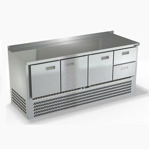 1970х700х850мм, Морозильный стол с бортом высотой 50мм, нижнее расположение агрегата. Столешница и корпус из нержавеющей стали марки AISI 430. Задняя панель и дно из оцинкованной стали. 3 двери, 2 ящика гастронормированных нагрузка по 35кг, направляющие с доводчиками (Австрия). Температурный режим -10...-18, напряжение 220В, мощность 460Вт, внутренний объем стола 460л, полезный объем стола 249л. Компрессор (Испания). Хладон R404. Петля доводчик (Польша). Полка решетка регулируемая по высоте с шагом - 45мм, гастронормированная, нагрузка 35кг. Нога опорная, регулировка 25мм. Поставляется в собранном виде.