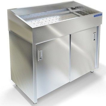 1200х600х1090мм, Стол-тумба для выкладки соков на льду. Ванна из нержавеющей стали марки AISI 304 толщиной 1,0 мм. Облицовка ванны из нержавеющей стали марки AISI 304 толщиной 0,8мм. Сливные трубки диаметром 20 мм 1шт. Внутри ванны перфорированный поддон из нержавеющей стали марки AISI 430 толщиной 0,8мм для аккумулирования холода. Двери-купе, полка. Корпус сварной из нержавеющей стали марки AISI 430 толщиной 0,8мм. Регулируемые опоры. Поставляется в собранном виде.