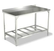 1200х700х850мм, Стол производственный без борта, столешница из нержавеющей стали AISI 430 толщиной 0,5 мм с подложкой ДСП толщиной 16 мм. Каркас из оцинкованной стали толщиной 1,5 мм, сплошная полка из оцинкованной стали толщиной 0,55 мм с усилителем. Полка стола выдерживает распределенную статическую нагрузку - 40 кг, столешница - 100 кг. Наличие подгибов по периметру столешницы и полки исключает опасность травм.