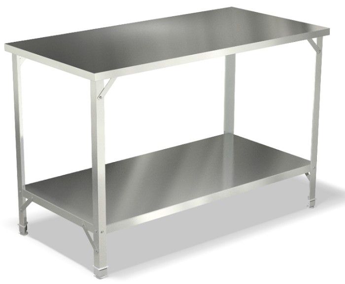 1500х700х850мм, Стол производственный без борта, столешница из нержавеющей стали AISI 430 толщиной 0,5 мм с подложкой ДСП толощиной 16 мм. Каркас из нержавеющей стали AISI 430 толщиной 1,5 мм, сплошная полка из нержавеющей стали AISI 430 толщиной 0,5 мм с усилителем. Полка стола выдерживает распределенную статическую нагрузку - 40 кг, столешница - 100 кг. Наличие подгибов по периметру столешницы и полки исключает опасность травм.