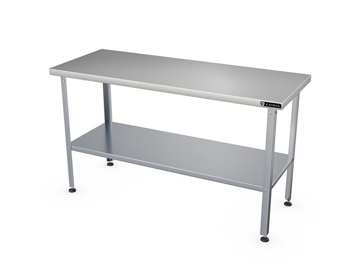 1100х600х870мм, нагрузка на столешниц 99кг, без борта, столешница нерж. сталь AISI430 0,8мм, подложка столешницы ДСП 16мм. Каркас оцинк. сталь толщина металла 1,2мм, уголок 40х40мм. Полка сплошная. Отсутствие борта позволяет располагать стол в любом месте помещения и осуществлять работу на нем с любой стороны и может быть установлен в центре кухни. Регулируемые ножки 20мм. Вес 18,6кг. Изделие разборное и поставляется в удобной упаковке.
