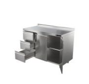 1000х700х870мм, 1 борт, нагрузка на столешницу 107кг, нагрузка на полку 42 кг. Столешница нерж. сталь AISI430 0,8мм, подложка столешницы ДСП 16мм. 2 распашные двери. Двери, боковые панели и столешница выполнены из нержавеющей стали AISI430. Дно и задняя стенка выполнены из оцинкованной стали. В комплект стола входит полка, усиленная ребром жесткости и 3 выдвижных ящика. Наличие полки позволяет увеличить полезное пространство в столе размещая на ней посуду, инвентарь, столовые приборы и сухие виды продуктов. Наличие выдвижных ящиков позволяет хранить посуду, инвентарь, столовые приборы и личные вещи персонала изолированно друг от друга. Регулируемые по высоте ножки 20мм. Вес 78,7кг.