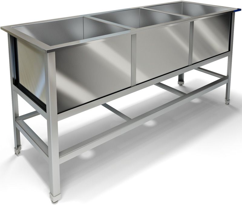 1150х430х850мм, Три сварные емкости размером 330х330х300 из нержавеющей стали марки AISI 304 толщиной 0,8мм, крыло. Каркас сварной из уголка 40х40 нержавеющей стали марки AISI 304 толщиной 2мм, внизу по периметру обвязка. Ванна комплектуется выпуском с нержавеющей решеткой и механическим запорным клапаном, диаметр выпуска 90мм, диаметр подключаемого сифона 50мм, регулируемые опоры. На дне ванны ребра (лучи) для жесткости и снижения вибрации. Ванна поставляется в собранном виде.