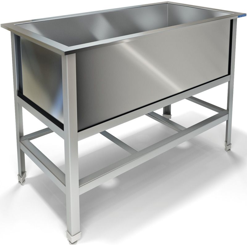1200х630х850мм, Одна емкость сварная размером 1100х530х400 из нержавеющей стали марки AISI 304 толщиной 0,8мм. Каркас сварной из уголка 40х40 нержавеющей стали марки AISI 430 толщиной 2мм, внизу по периметру обвязка. Ванна комплектуется выпуском с нержавеющей решеткой и механическим запорным клапаном, диаметр выпуска 90мм, диаметр подключаемого сифона 50мм, регулируемые опоры. На дне ванны ребра (лучи) для жесткости и снижения вибрации. Ванна поставляется в собранном виде.