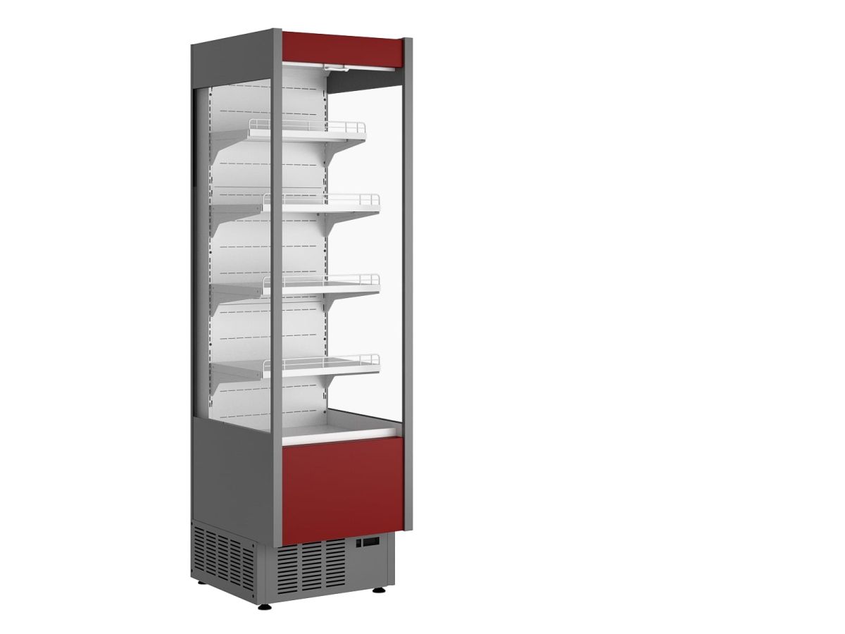 591х670х2070, t режим +1…+10 C. Витрина холодильная,со встроенным агрегатом, гнутое стекло, 4 металлических полки, полезный объемвыкладки— 0,29 м3,охлаждаемая площадь поддонов для выкладки продуктов 1,00 м2, динамическое охлаждение, оттайка ТЭН, потр. эл.энергии в сутки —9 кВт, R404A, цвет корпуса —белый, фриз и щиток — красный, 14,4Вт, 220В.