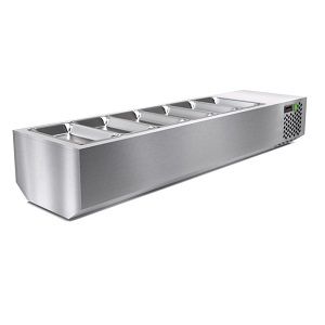 1970х385х265мм, Витрина охлаждаемая настольная открытая, изготовлена из нержавеющей стали марки AISI 430. Температурный режим +2…+7, вместимость: GN 1/3 - 9х150, мощность 100Вт. Компрессор (Китай). Хладон R-134. Поставляется в собранном виде.